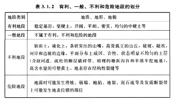 3.1.2 建筑与市政工程进行场地勘察时,应根据工程需要和地震活动情况、工程地质和地震地质等有关资料按表3.1.2对地段进行综合评价,对不利地段,应尽量避开;当无法避开时应采取有效的抗震措施,对危险地段,严禁建造甲、乙、丙类建筑。