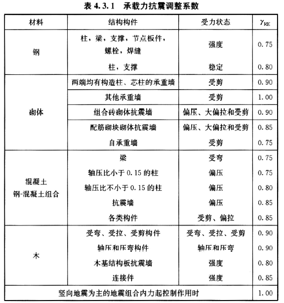 γRE——承载力抗震调整系数,除本规范另有专门规定外,应按表4.3.1采用。