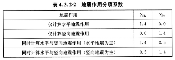 γEh、γEv——分别为水平、竖向地震作用分项系数,其取值不应低于表4.3.2-2的规定;