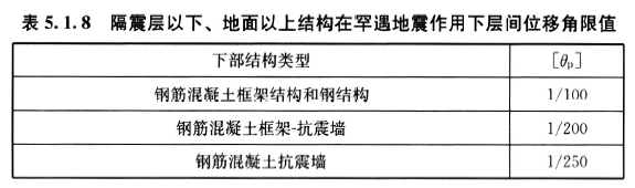 2 隔震层以下、地面以上的结构,在罕遇地震下的层间位移角不应大于表5.1.8的限值要求。