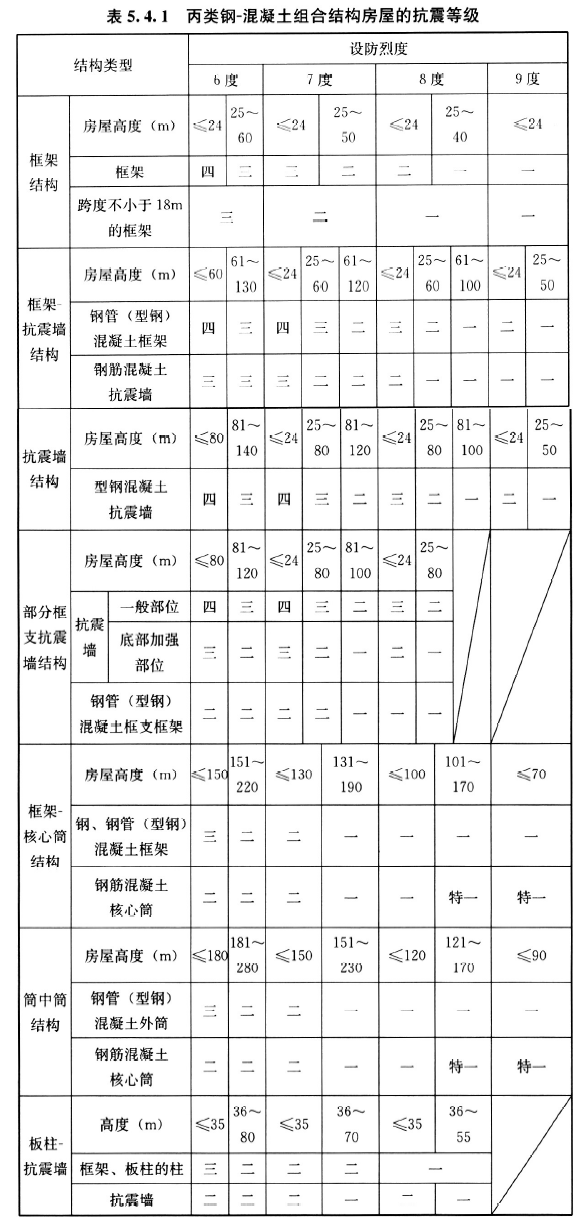 5.4.1 钢-混凝土组合结构房屋应根据设防类别、设防烈度、结构类型和房屋高度按下列规定采用不同的抗震等级,并应符合相应的内力调整和抗震构造要求。