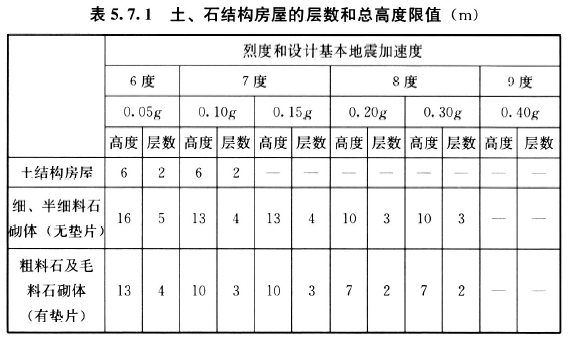 5.7.1 土、石结构房屋的高度和层数应符合表5.7.1的规定。