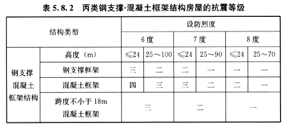 5.8.2 钢支撑-混凝土框架结构房屋应根据设防类别、设防烈度和房屋高度采用不同的抗震等级,应符合相应的内力调整和抗震构造要求,并应符合下列规定: