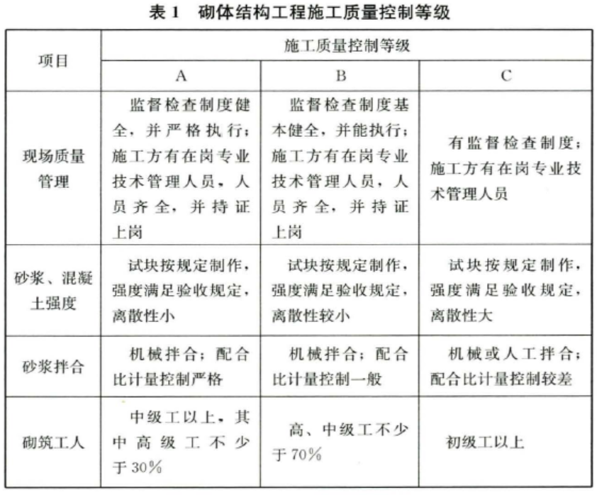 2.0.7 对砌体结构而言,砌体强度与材料质量和施工水平相关。对于施工水平,由于在砌体的施工中存在大量的手工操作,因此砌体结构的施工质量在很大程度上取决于人的因素。在《欧洲规范6:砌体结构设计—第1-1部分:配筋和无筋砌体结构的一般规则》BS EN1996-1-1:2005中,施工水平按质量监督人员、砂浆强度试验及搅拌、砌筑工人技术熟练程度等情况分为五级,材料性能分项系数也相应取为不同的数值。为与国际标准接轨,本条采用分级的方式将砌体结构施工质量控制等级分为三级,并考虑砌体施工质量控制等级对砌体强度设计值的影响。为保证设计工作年限50年及以上的砌体结构工程的可靠性,规定其施工质量控制等级不应低于B级。砌体结构工程施工质量控制等级的划分见表1。