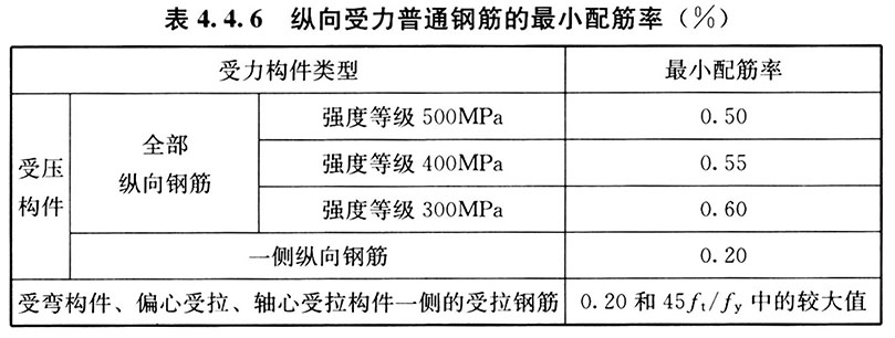 4. 4. 6 除本规范另有规定外,钢筋混凝土结构构件中纵向受力普通钢筋的配筋率不应小于表4. 4. 6的规定值,并应符合下列规定: