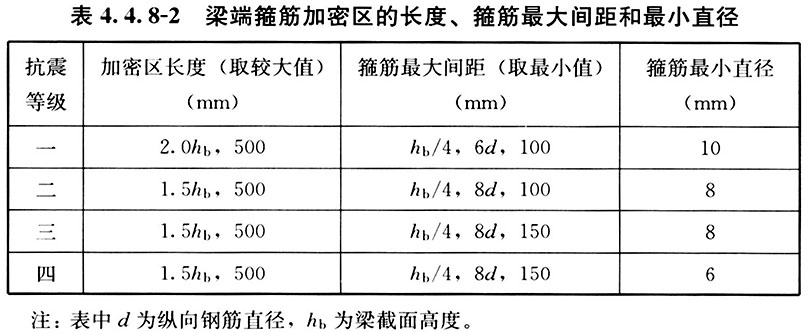 4 梁端箍筋的加密区长度、箍筋最大间距和最小直径应符合表4. 4. 8-2的要求;一级、二级抗震等级框架梁,当箍筋直径大于12mm、肢数不少于4肢且肢距不大于150mm时,箍筋加密区最大间距应允许放宽到不大于150mm。