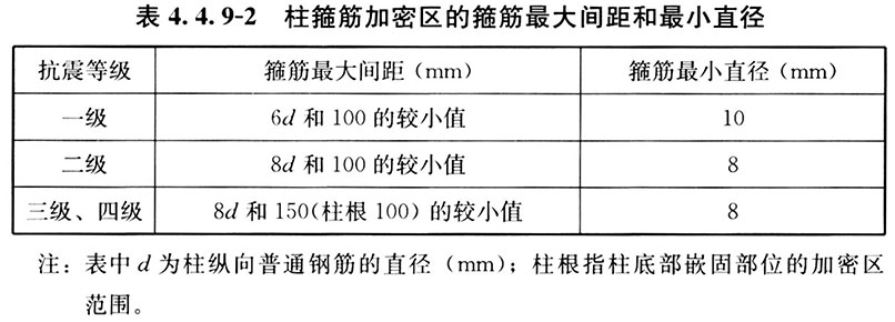 1)箍筋加密区的箍筋最大间距和最小直径应按表4. 4. 9-2采用。