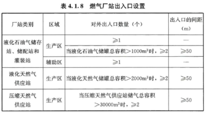 4.1.8 燃气厂站道路和出入口设置应满足便于通行、应急处置和紧急疏散的要求,并应符合表4.1.8的规定。