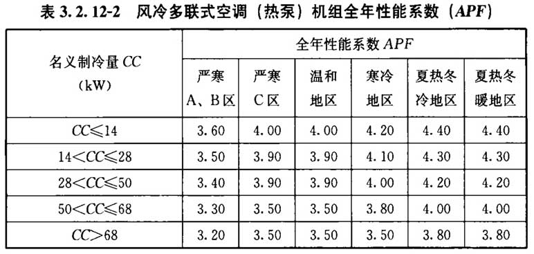 3. 2. 12 采用多联式空调(热泵)机组时,其在名义制冷工况和规定条件下的能效不应低于表3. 2. 12-1、表3. 2. 12-2的数值。