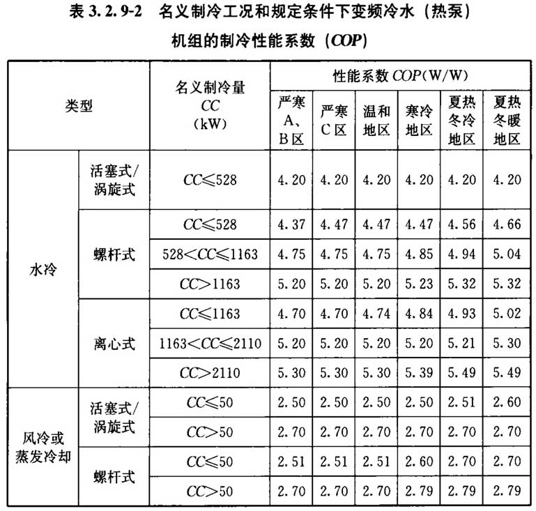 2 变频水冷机组及风冷或蒸发冷却机组的性能系数(COP)不应低于表3. 2. 9-2中的数值。