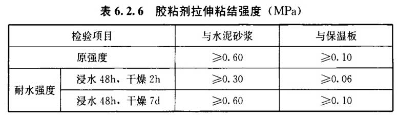 6. 2. 6 胶粘剂拉伸粘结强度应符合表6. 2. 6的规定,胶粘剂与保温板的粘结在原强度、浸水48h后干燥7d的耐水强度条件下发生破坏时,破坏部位应位于保温板内。