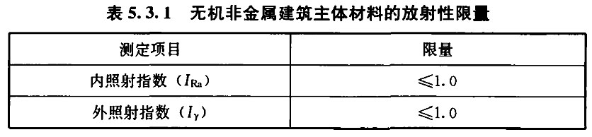 5. 3. 1 建筑工程所使用的砂、石、砖、实心砌块、水泥、混凝土、混凝土预制构件等无机非金属建筑主体材料,其放射性限量应符合表5.3.1的规定。
