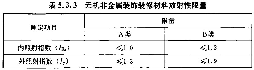 5. 3. 3 建筑工程所使用的石材、建筑卫生陶瓷、石膏制品、无机粉状粘结材料等无机非金属装饰装修材料,其放射性限量应分类符合表5. 3. 3的规定。