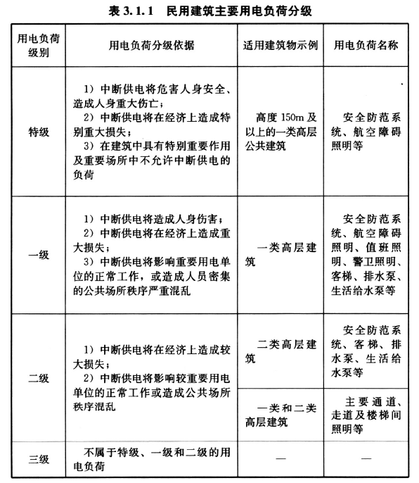 3. 1. 1 民用建筑主要用电负荷的分级应符合表3. 1. 1的规定。
