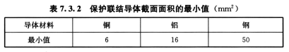 7. 3. 2 接到总接地端子的保护联结导体的截面面积,其最小值应符合表7. 3. 2 的规定; 由等电位箱接至电气装置单独敷设的保护联结导体最小截面面积应符合本规范第7 . 2 . 10 条的规定。