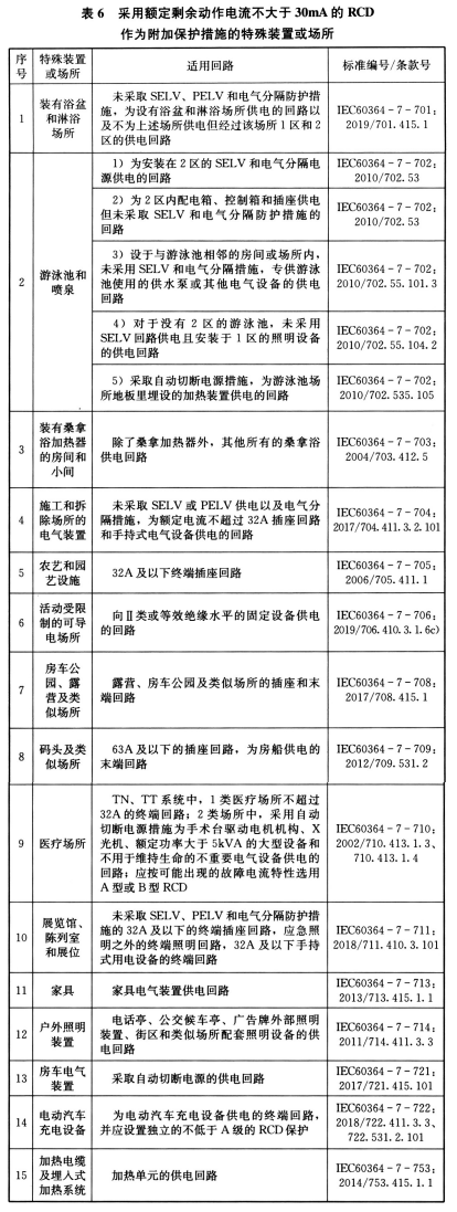 国际电工委员会IEC 的标准《低压电气装置》第7部分IEC60364 第7部分系列标准对各类特殊装置或场所均有此项要求,详见表6 。