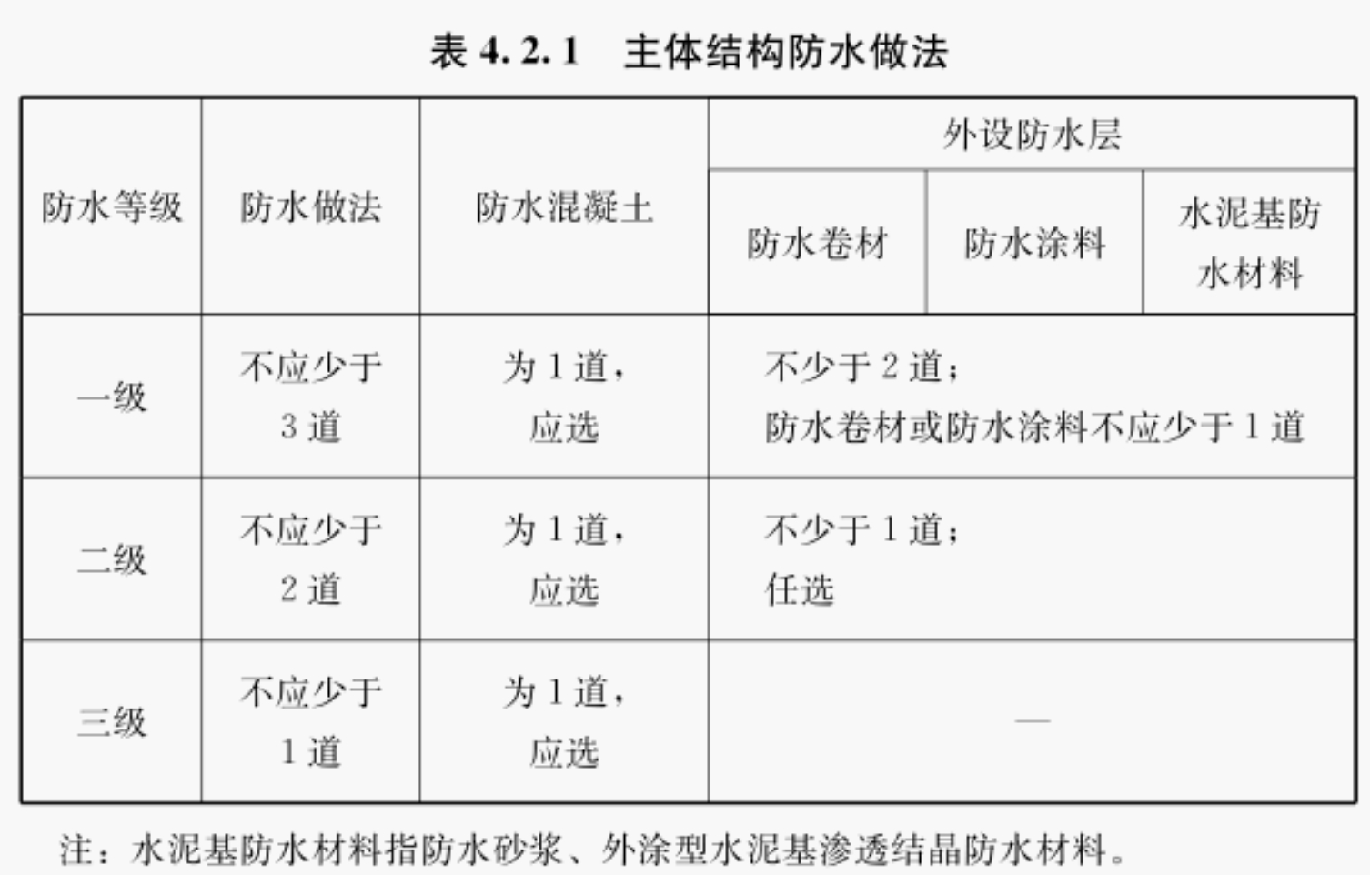 1 主体结构防水做法应符合表4. 2. 1的规定。