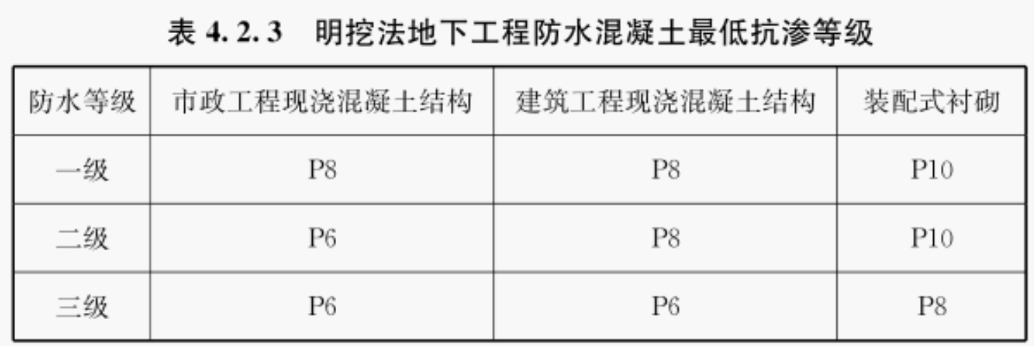 4. 2. 3 明挖法地下工程防水混凝土的最低抗渗等级应符合表4. 2. 3的规定。