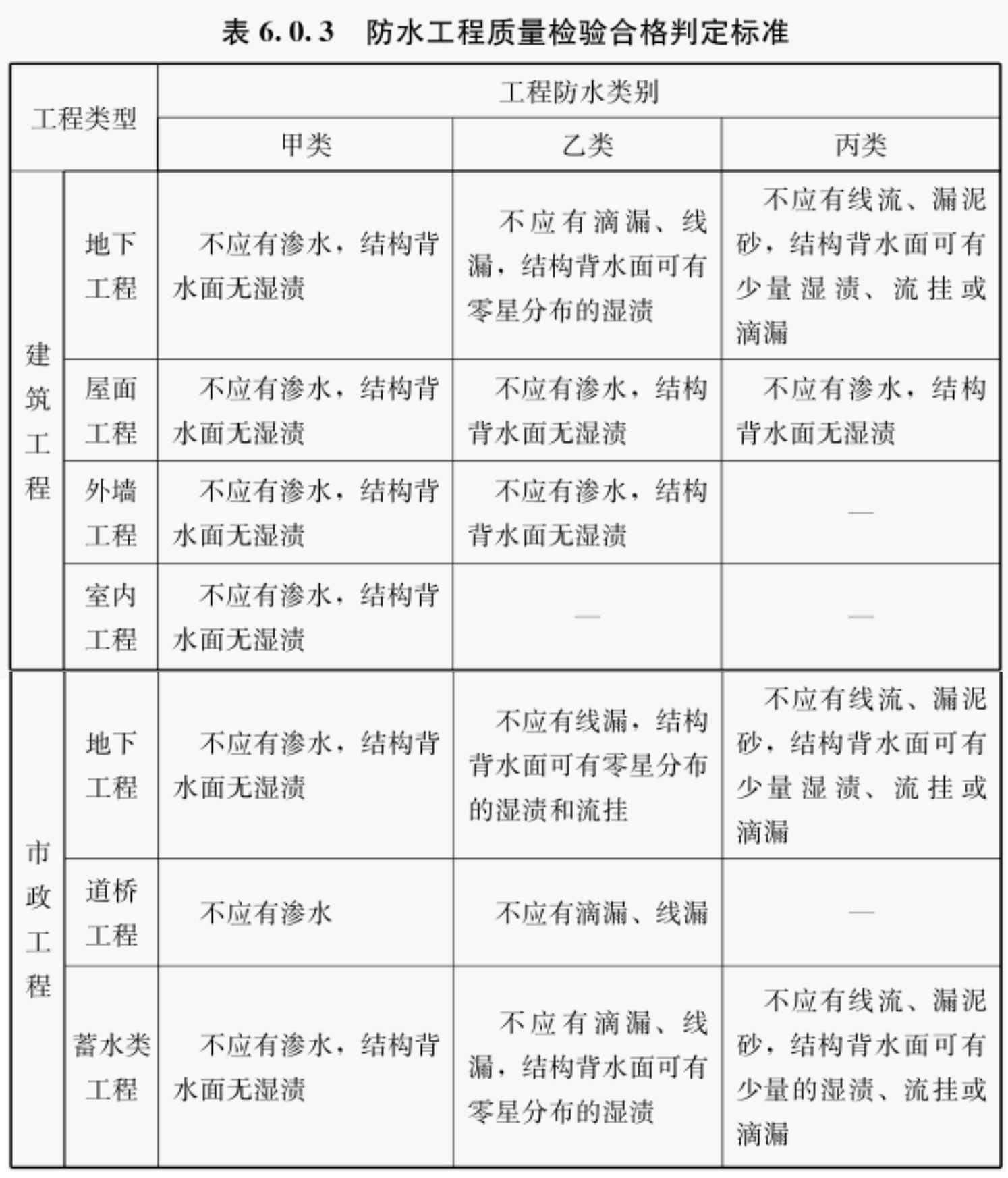 6. 0. 3 防水工程质量检验合格判定标准应符合表6. 0. 3的规定。