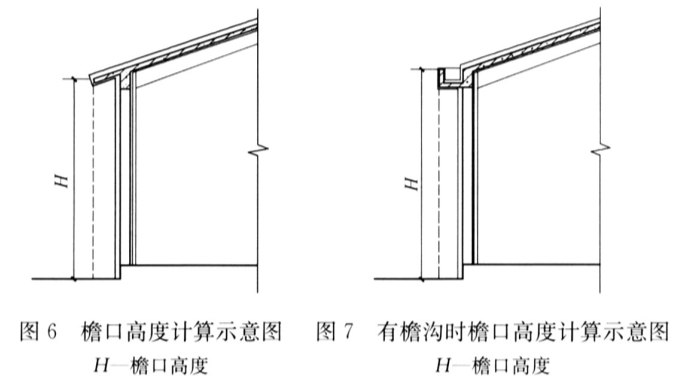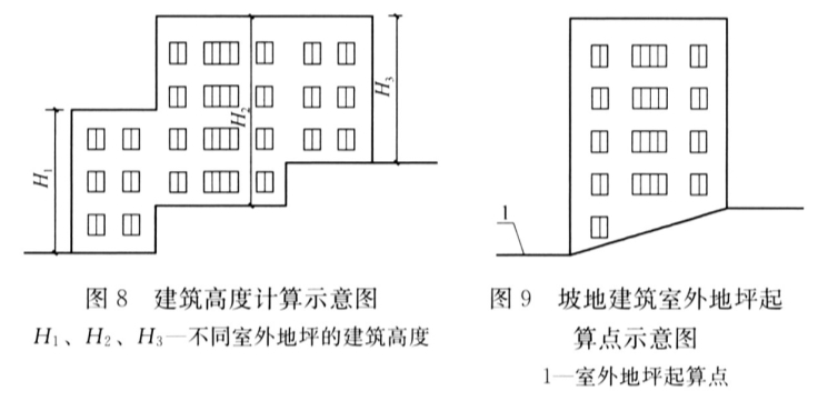 3. 2. 1~3. 2. 3 对除第3.2.4条、第3.2.5条情形外的建筑物高度起算点进行了规定,基本的原则是真实地反映建筑物的实际高度,本规范中规定的建筑高度有别于防火规范里的建筑高度。其中,第3.2.2条规定坡屋顶建筑应分别计算檐口(见图6、图7)和屋脊高度,此处的檐口高度是指室外设计地坪至屋面檐口(坡屋面最低点)的高度,也即檐口结构板最外缘的顶标高(见图6);当有檐沟时,檐口高度为檐沟(或构件)最外缘的顶标高(见图7)。第3.2.3条规定当同一座建筑物有多种屋面形式,或台地建筑有多个室外设计地坪(地面面层)的情形(不包含地下室的下沉庭院),建筑高度应分别计算后取其中最大值(见图8),若H2≥H3,且H2≥H1,则建筑高度为H2;对于坡地建筑,室外地坪起算点,应为建筑围护结构外表面与室外设计地坪(地面面层)交界的最低处(见图9)。