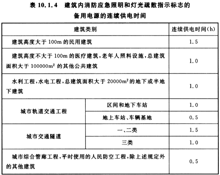 10. 1. 4 建筑内消防应急照明和灯光疏散指示标志的备用电源的连续供电时间应满足人员安全疏散的要求,且不应小于表10.1.4的规定值。
