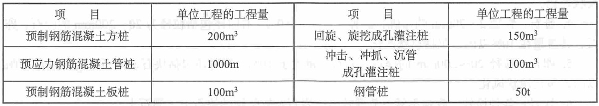 八、单位工程的桩基工程量少于下表对应数量时,相应项目人工、机械乘以系数1.25。灌注桩单位工程的桩基工程量指灌注混凝土量。