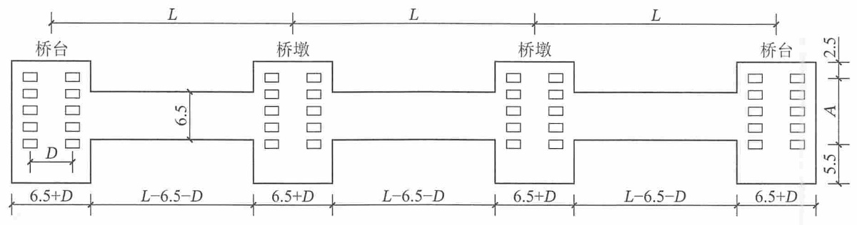 A——桥台(桥墩)每排桩的第一根桩中心至最后一根桩中心之间的距离(m)。